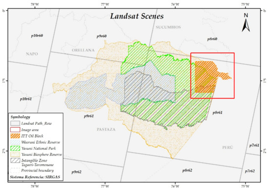 Footprint of satellite images (Landsat 7 and 8) in the ITT Oil Block of the Ecuadorian Amazon region.