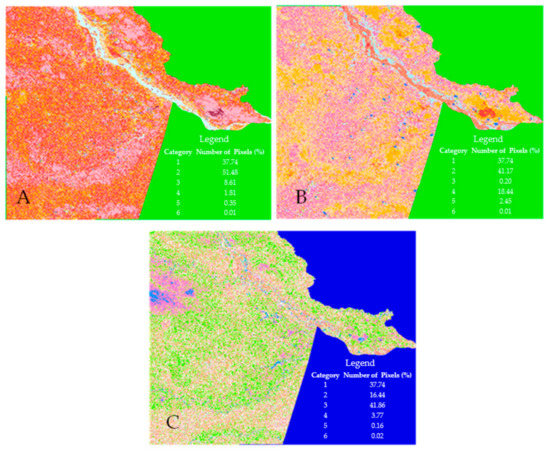 Unsupervised classification of the in the ITT Oil Block of the Ecuadorian Amazon region: (A) 2001; (B) 2014; and (C) 2017 with the PCI Geomatics program.