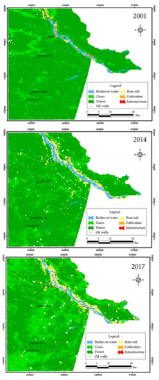 All these procedures were applied, for the 3 satellite images in the years 2001, 2014, and 2017 in the study area.