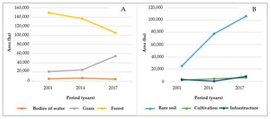This methodology was applied in order to calculate the difference between the categories of the different periods. That is, the loss or increase in area in hectares of each category was calculated over the years using the ARCGIS 10.7 program with the Tabulate Area tool (ArcToolbox/Spatial Analyst Tools/Zonal). It automatically generated a matrix of the areas of each category in hectares for the three periods [82].
