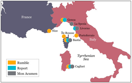 To sum up, the port area presents many critical aspects, such as the high number of sources operating in the port area that work continuously and in a random pattern, the traffic induced by port activities that produces noise far away from the port boundaries and mixes with regular traffic. All these issues have also emerged in the seven ports of the North Tyrrhenian Sea ports involved in the projects Rumble, Report, and Mon Acumen. Excluding the port of Portoferraio, the involved ports are some of the most important ports of Italy and France and, of course, of the entire Mediterranean Sea. Figure 1 shows the positions and affiliations of the ports on a map.