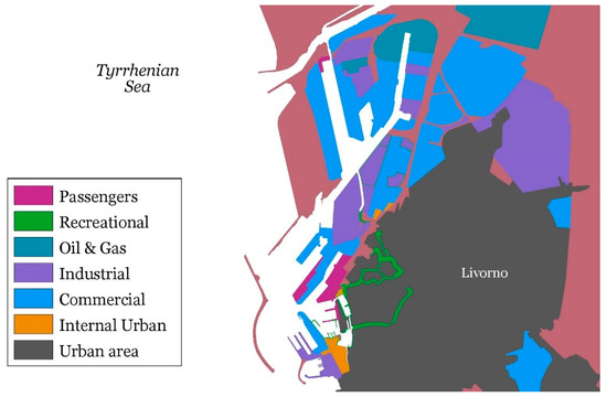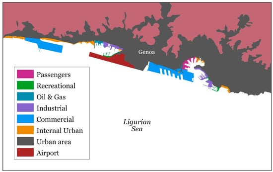 Industrial plants are present in almost every port involved in the project. As examples of the critical issues of ports with many industrial and operational areas with different machinery (noise sources) and surrounded by inhabited areas, Figure 2 and Figure 3 report Genova and Livorno maps with the area marked according to their use.