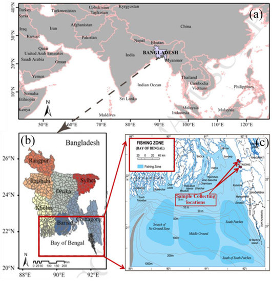 The marine environment is one of the most important sources of life on Earth and performs a number of key environmental functions for the lives and livelihood of humans and other organisms. Marine environmental pollution is a longstanding global problem. Marine pollution affects the Bay of Bengal because of the vulnerability of its aquatic habitats to such pollution following the industrial revolution in the 19th century. Most aquatic ecosystems can cope with a certain degree of pollution, but severe pollution is reflected in changes in the fauna and flora of their communities [1]. Developing countries, including Bangladesh, are most affected by this human-made problem. Bangladesh is considered to be one of the most suitable countries for the Blue Economy following the recent establishment of a vast maritime boundary in the Bay of Bengal. The result of two verdicts on maritime boundaries, also involving Myanmar and India, allows Bangladesh to exclusively exercise its sovereign rights over 118,813 sq km of water. The affected area extends up to 12 nautical miles into territorial sea and includes a further Exclusive Economic Zone (EEZ) of 200 nautical miles [2]. However, agriculture runoff, untreated sewage, and industrial pollution are reportedly being discharged directly into rivers, eventually flowing into the Bay of Bengal. This effluent may contain radioactive materials and trace metals and pose a particularly serious threat to the coastal environment and the aquatic ecosystems [3,4].