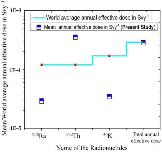 Comparison between the estimated annual effective doses obtained in the present study with the world average values [32].