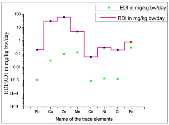 EDI and mean EDI values of respective trace elements (Cd, Pb, Zn, Cu, Ni, Fe, Mn, and Cr) for the fish and crustacean samples of both seasons are shown in Table 8. The corresponding Figure 3 shows the comparative results of estimated daily intake (EDI) values with the recommended daily intake (RDI) values. As the values of EDI < RDI for both fish and crustaceans, there is no risk from the consumption of the studied seafood.