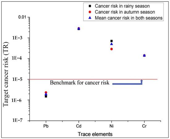For carcinogens, the target cancer risk (lifetime cancer risk) is estimated as the incremental probability of an individual to develop cancer over a lifetime exposure to that potential carcinogen (i.e., incremental or excess individual lifetime cancer risk) [38]. Acceptable risk levels for carcinogens range from 10−4 (risk of developing cancer over a human lifetime is 1 in 10,000) to 10−6 (risk of developing cancer over a human lifetime is 1 in 1,000,000). The equation used for estimating the target cancer risk, which is dimensionless, is as follows [38]: