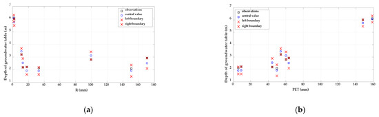 The results of the fuzzy linear regression(FLR)-1 model in the case of well194, (a) the rainfall R and the groundwater depth DGW, and (b) the potential evapotranspiration (PET) and the groundwater depth DGW.