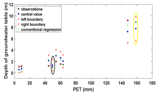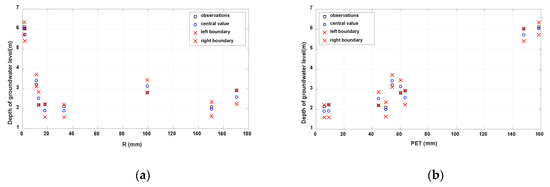 where and are the left boundary and the right boundary of the estimated , respectively, while is the observation of the groundwater depth at the examined point in time j.