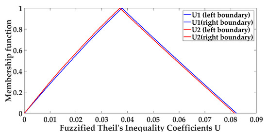 Let be a fuzzy number (here, the fuzzified Theil’s inequality coefficients). Then, the left and right areas are the integral between the inverse functions of the left and right branches of the membership functions of , respectively, and the x-axis (Figure A1).