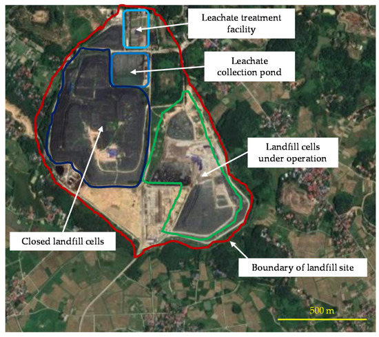 One of the most common techniques for handling MSW in developing countries has been landfilling because of the higher capacity and lower capital and operation costs than modern waste management methods [12,13]. In Vietnam, the volume of MSW reaches more than 64,000 tons/day, and waste generation is increasing at ~5.1%/year [14]. Regarding four currently common methods for treating MSW in Vietnam—landfilling (63%), composting (4%), recycling (10%), and incineration (14%) [14]—landfilling is the major disposal method. According to a report by the Ministry of Construction [15], there are a total of 657 landfill sites under operation in Vietnam (total area = 4900 ha), and 31% of these are certified as engineered landfills with sanitary conditions. In Hanoi, the daily MSW generation is estimated at approximately 6,500 tons [15]. There are four landfills which are engineered landfills with a large capacity, namely, Nam Son, Kieu Ky, Xuan Son, and Nui Thong landfill sites. Hanoi city set a plan to operate 17 solid waste disposal complexes including eight existing zones and upgrading and expanding nine newly established zones [16].
