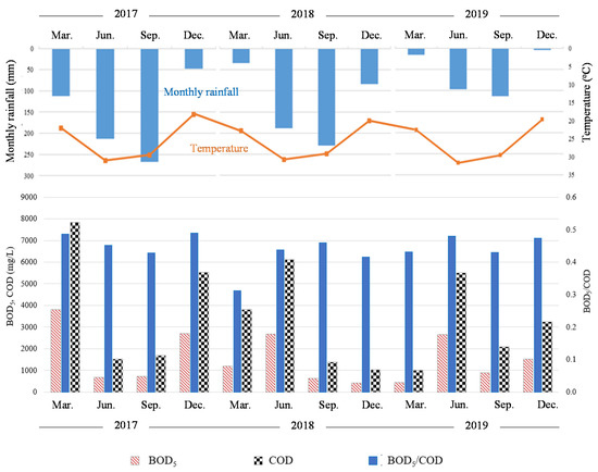 Seasonal variation of BOD5, COD, and BOD5/COD of Nam Son landfill leachate from 2017 to 2019. Note that the permissible levels of BOD5 and COD are 50 and 150 mg/L (QCVN 40:2011/BTNMT. National technical regulation on industrial wastewater).