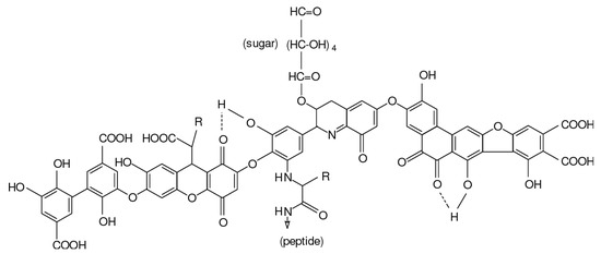 Humic acids consist of humic substances that are organic matter residing in sediments of vegetable decay and residue, terrestrial soil as well as natural water. Humic acid is also one of the major substances that need to be recovered from agricultural wastewater. This compound is an amphiphilic substance and is partially soluble in water, completely soluble in alkaline solutions and insoluble in acidic solutions. This property makes it widely used in medicine, pharmaceuticals, pollution remediation and agriculture. As a weak acid, humic acids are found in substances used as an electrolyte and contains carboxylic (-C(=O)OH) and phenolic groups. It is also a parent form of another organic compound called fulvic acid. They differ in their oxygen and carbon contents, acidity, molecular weight and polymerization. The way to form humic acid is through natural and sustainable fermentation using an empty fruit bunch of palm trees as a substrate. It can also be produced by chemical methods such as polymerization and condensation reactions [33]. Figure 2 depicts the model molecular structure of humic acid predicted by Stevenson in 1982 [34]. The structure of humic acid is complex, with many binding sites where several interactions can take place between humic acid and the environmental media (e.g., soil and water). Each binding site of the compound has a different form of stereochemistry, which is determined by the interactions and mechanisms with other compounds [35].