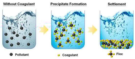 The most widely used aluminum coagulants include aluminum chloride, aluminum sulfate and sodium aluminate. Common iron salts used as coagulants include ferrous sulfate, ferric sulfate, ferric chloride sulfate and ferric chloride. The metal cation from these salts and the hydroxide from the water can reduce repulsion forces between the colloids (see Figure 3) and trap particles with their coagulant, which makes them destabilize the pollutants [50]. The performance of the coagulants depends on the pH of the solution, the mixing intensity and the dose of coagulants. Finally, the trapped particles settle to the bottom and form a bottom layer of sludge. However, a significant amount of sludge forms as a result of the coagulants reacting with humic substances in the water. These sludges can be quite hazardous at times, which make them difficult to dispose of. It can also be extremely difficult to separate the formed sludge from the water due to their heavy water content.