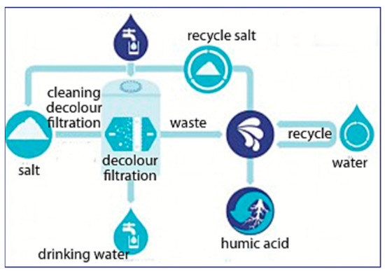 Adsorption is a surface phenomenon and is the mass transfer process that occurs when a substance is transferred to a solid from a liquid phase and bounded either chemically or physically. Therefore, the structure of the adsorbent surface plays a critical role in surface reactivity and adsorption capacity. When a solid with a reactive or ionic surface makes contact with a highly adsorbable solute, the intermolecular forces of attraction between the liquid and the solid surface allow the liquid to be deposited on the porous surface. The temperature, pH and column design also affect the adsorption efficiency. Recent solutions use exchange adsorption methods to remove and recover humic acid from wastewater [74]. Undergoing NF and then electrodialysis to regenerate both anions and cations, humic acid can at least be separated from other salts present in the surroundings. Nonetheless, there have been a couple of new inventions and ideas by scientists who have been trying to recover humic acid. In 2015, two companies, i.e., Royal Haskoning DHV (an engineering company) and Vitens (a water supply company) jointly invented a novel technology, called “HumVi” as shown in Figure 4, to recover humic acid in its natural state as a fertilizer. The HumVi technology originates in Holland and is used to reclaim humic acid in its purest form and other salts from agricultural wastewater [75]. There is not much information or many studies on this technology; however, the concept of the process flow and designs can be utilized in future research.