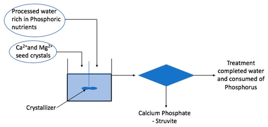 Figure 5 illustrates the schematic diagram of nitrogen and phosphorus recovery from wastewater. The pH of the solution is mainly responsible for the rate of this reaction. The multivalent metal ions, e.g., calcium, aluminum and iron, are commonly used in precipitation. In the precipitation mechanism, lime/calcium hydroxide is introduced to raise the pH of the solution and leads to the formation of calcium carbonate. Struvite crystallization proceeds in a two-stage process. The first stage is nucleation and the second stage is crystal growth. These two stages allow the struvite to develop from its generation stage to its development stage. Nucleation occurs when Mg2+, NH4+ and PO43− collide under proper pH conditions and form a saturated solution from the mixing of the ions. The mixing velocities play a critical role in the quantity of struvite crystal formation, which further affects the recovery ratio of phosphorus from wastewater.