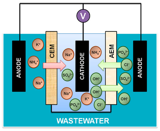 Schematic diagram of Removing-Recovering Bio-Electrochemical System (R2-BES) for recovery of nitrogen and phosphorus from wastewater. Abbreviations: CEM (cation exchange membrane); AEM (anion exchange membrane). Adapted from the ref. [102].