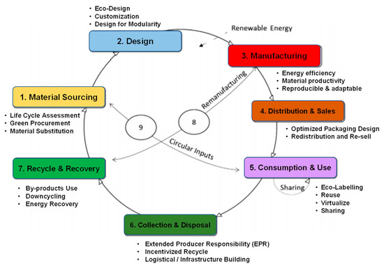 CBE is a key element of the green economy, which is resource-focused on saving material costs, improving security of supply to promote economic growth by creating new businesses and circularity work as well as reducing environmental impacts [116,117]. It solves the linear economic problems by new circular resource flows, decoupling economic growth from resource consumption. Kalmykova et al. [117] constructed the Circular Economy Strategies Database that is applied in each part of the value chain in the circular economy, as shown in Figure 9. Industrial symbiosis is one of the successful implementations of the circular economy to share and circularly input the resource. In addition to developing technology for improving energy efficiency and reducing resource consumption, a new business model is more critical for enterprises to gain economic benefits and sustainable development. A growing amount of research is focused on business model innovation [118,119]. For consumers and public buyers, the green certification and green finance, e.g., carbon negative products and green bonus, can also be a component in the business model and support the development of CBE.