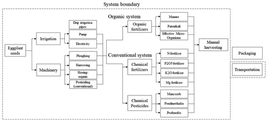 - Seedling planting and eggplant harvesting. These are undertaken manually (no machinery or energy input) in both organic and conventional cases, and as such they are not expected to affect the results. Therefore, seedling planting and eggplant harvesting are external to the system boundary. However, the eggplant seeds are included in the system boundary.