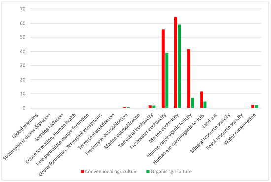 First, the ReCiPe LCIA method was applied at midpoint level and per unit of area (1000 m2 of cultivation area), in order to gain a robust, in-depth understanding of the environmental impact of each cultivation system. Figure 2 presents a comparison between organic and conventional cultivation systems using ReCiPe’s 18 midpoint impact categories (Characterization) expressed per unit of area FU. Conventional eggplant cultivation makes a larger contribution than organic cultivation in most midpoint impact categories, in particular human carcinogenic toxicity and human non-carcinogenic toxicity, where organic agriculture showed 83.00% and 60.57% lower scores than conventional agriculture, respectively. Furthermore, organic cultivation attained 27.07% and 38.12% lower scores than conventional agriculture in freshwater and marine ecotoxicity impact categories, respectively. However, organic agriculture has a larger effect in land-use impact category (7.44% higher score than conventional agriculture), reflecting the use of effective microorganisms. As mentioned above, the proxy LCI data for the effective microorganisms were based on the treatment of whey by fermentation, and therefore the impact on land use is traced back in animal feed and specifically the land that is required for animal feed cultivation. Nonetheless, as shown in Figure 3, the normalised scores of land use are very low, suggesting an overall low influence on the environmental performance of both cultivation systems. Furthermore, organic agriculture’s larger scores in the ozone formation categories (48.57%), fine particulate matter formation (10.49%), and terrestrial acidification (8.33%) impact categories can be attributed to: (i) the manure loading and spreading process, which is responsible for a high load of airborne emissions, including fine particulate matter; and (ii) high ammonia emissions from manure volatilisation. The overall larger contribution of the conventional system across impact categories is mainly attributed to use of chemical fertilizer and pesticide.