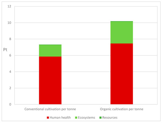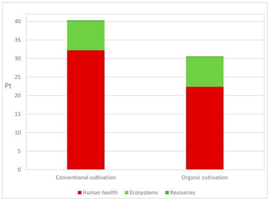To directly compare conventional with organic eggplant cultivation systems, the results are examined at endpoint level. We consider ReCiPe’s three damage categories, i.e., human health, ecosystems, and resources. For easier comparison, the endpoint results for each cultivation system were aggregated into a single score. Figure 4 shows that the annual environmental footprint per unit of area (1000 m2 of cultivation area) is 40.29 Pt and 30.56 Pt for conventional and organic systems. Therefore, in terms of per unit of area FU, the organic system exhibits a 24.15% lower total environmental footprint compared to the conventional system. The damage category with highest score in both cultivation systems is human health, followed by biodiversity (ecosystems), whereas resource availability has a very low score in both systems. The score in the human health damage category is mainly affected by emissions originating from fossil fuel extraction and burning for electricity production required to drive the irrigation process. Chemical fertilizer production, an energy intensive process where harmful emissions are also released, contributes to the higher score of the conventional system in this category. Airborne emissions from fertilizer application in both systems affect scores in the human health category, because of the significant implications of ammonia emissions on human health [37].