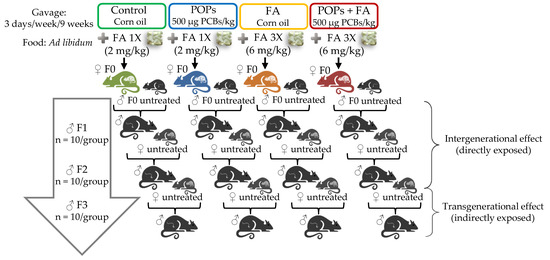 As shown in Figure 1, F0 Sprague–Dawley founder dams were fed the 1× or 3× diet [28] and received by gavage (3 days/week) either a corn oil control or the POP mixture starting at the age of 7 weeks. The F0 females were weighed three times a week prior to gavage. At the age of 12 weeks, they were mated with untreated F0 males. Except during mating, sires were fed the control diet only. Reproduction plus gestation was 4 weeks long. The experimental treatments thus lasted 9 weeks. All F0 postpartum females were fed the control diet only and the POP mixture treatment was ended. The four experimental groups (n = 6/group) were thus (1) corn oil plus 1× FA (CTRL), (2) POP mixture plus 1× FA (POPs), (3) corn oil plus 3× FA (FA), and (4) POP mixture plus 3× FA (POPs + FA).