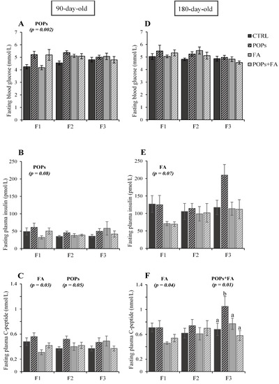 Data are expressed as the mean ± standard error of the mean (SEM) for each treatment group. One-way analysis of variance (ANOVA) for a 2 × 2 factorial design using the MIXED procedure (SAS software version 9.4, SAS Institute Inc., Cary, NC, USA) was applied to fasting variables when comparing the four groups. Two-way ANOVA with repeated measurements was applied to data at different time points during the glucose tolerance test. The F0 founder female for each male rat was controlled in the model. When non-normal data were observed, a logarithmic transformation of the data was performed to obtain normality. The main effects of POPs and FA as well as their interaction (POPs*FA) were then determined. Differences were considered significant at p ≤ 0.05. When a significant (p ≤ 0.05) POPs*FA interaction was observed, the Tukey Honest Significant Difference (HSD) test was performed to determine between-group differences.