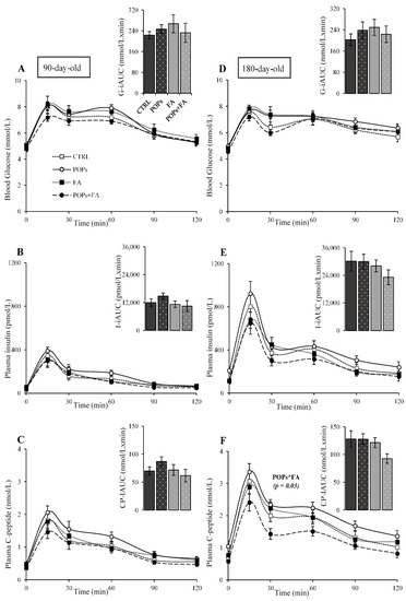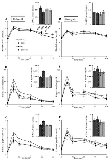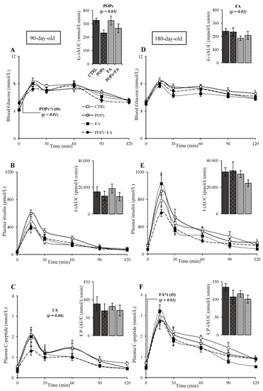 Impact of POP exposure and/or FA supplementation of F0 female rats on blood glucose, plasma insulin and C-peptide during a glucose tolerance test in F1 male rats aged 90 days (A–C) and 180 days (D–F). The histogram shows incremental area under the curve (IAUC) values. Results are expressed as mean ± SEM (n = 7 to 10). Two-way ANOVA with repeated measurements was used to compare time points within groups. ANOVA for a 2 × 2 factorial experiment was used to analyze the POP and FA main effects and the POPs*FA interaction.