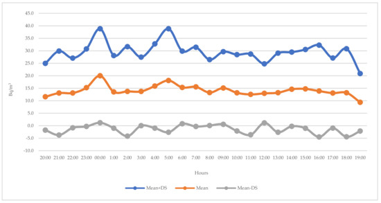 Average values and standard deviations of radon in the 24 inspections—a 24-h trend.