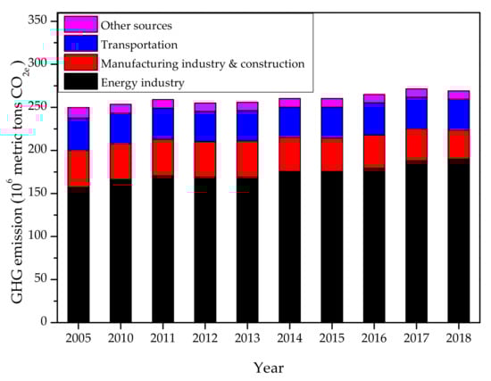 - During the period of 2005–2019, the change in the total emissions did not vary much with the exception in 2009, ranging from 249.9 to 269.1 MtCO2eq. An increase of 7.68% in the GHG emission was obtained at an average annual growth rate of 0.57%. The total GHG emission in 2018 was slightly lower than the previous year by 0.88%. This stable situation was mainly due to the regulatory measures and promotional actions, including renewable energy development, improvement of energy efficiency, and energy conservation [42,43,44]. For example, the electricity generation by renewable energy sources significantly increased from 7808 GWh in 2009, to 15,247 GWh in 2019 [45]. Herein, the data in 2019 were estimated by the authors based on the energy statistics in 2019 [45].