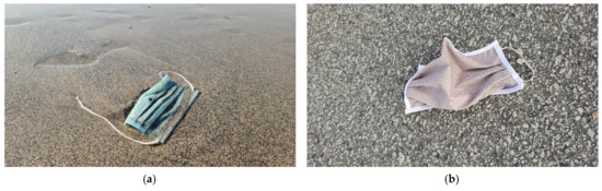 Incorrect disposal of masks observed in Portugal: (a) disposable masks on a beach and (b) reusable mask on an urban street.