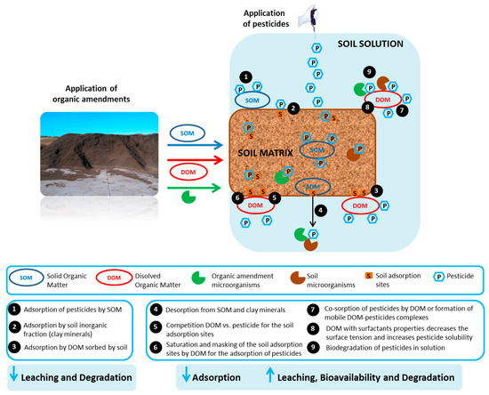 The addition of OM through organic amendments plays a major role in the fate of xenobiotic compounds including pesticides [73,74]. The solid organic matter (SOM) and dissolved organic matter (DOM) of these amendments applied to the soil may modify the physicochemical behavior of pesticides (e.g., adsorption–desorption, persistence, bioavailability, degradation, and mobility), affecting soil quality and surface and ground waters [34,75,76,77,78,79] (Figure 1).