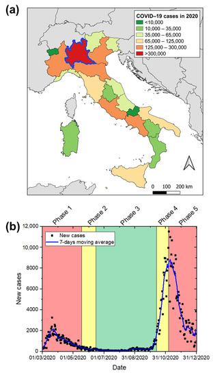 Italy has been severely and rapidly impacted by the COVID-19 diffusion [27], with more than 70,000 fatalities in 2020, reaching a fatality rate of 7.2% among the infected [28]. The Lombardy region (Figure 1a), in more detail, is among the most affected areas, presenting a hot-spot in contagions, with a total of 195,000 infected, updated to 1 November 2020 [29,30,31].