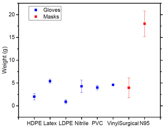 Weight for gloves of every different polymer and masks of different typologies (HDPE: High-Density Polyethylene, LDPE: Low-Density Polyethylene, PVC: Polyvinyl Chloride). Symbols indicate the average value, while bars indicate the standard deviation.