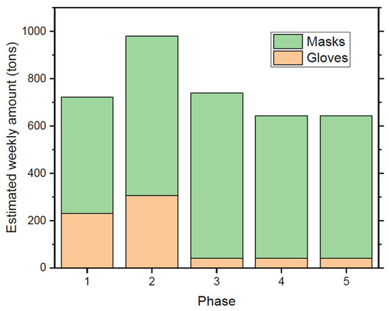 Figure 4 shows the potential amount of waste generated weekly in the different phases, divided into masks and gloves. It is observable that generally, the use of PPEs by the general population was inversely correlated with the mobility restrictions since social distancing favors protection without any possible negative impact on the environment. It is clear, in fact, that during the 1st phase, the use of masks by the general population was quite limited compared to the following ones. The trend for gloves was highly different since these PPEs were highly consumed in the first period of the pandemic in Italy, but then their use was only suggested for some professional sectors, and the use by the general population was notably reduced. Therefore, considering the overall plastic waste production during 2020 from PPEs, the 2nd phase resulted in the most impacting. Considering that 2% of total plastic waste was estimated to be PPEs directly dispersed into the environment [49], in this period of maximum production, up to 18 tons of plastic waste could be directly spread into the environment every week.