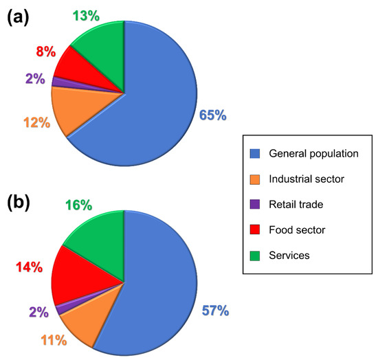 Pie charts showing the production rates of wastes from different sectors regarding masks in the whole year 2020 (a) and gloves in the period of phases 1 and 2 (b).
