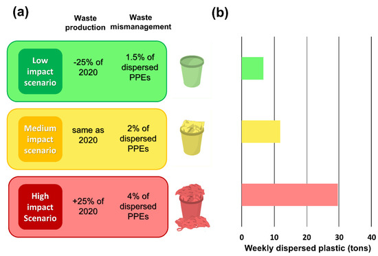 (a) Parameters used for the establishment of a future scenario (including an increasing, decreasing, or similar weekly amount of the 2020 average value and different rates of mismanaged waste [49]). (b) Estimated dispersed plastic waste from PPEs usage weekly in the different scenarios.