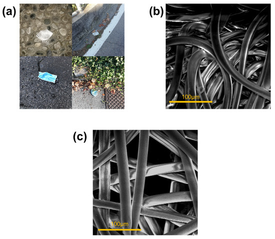 Photos of dispersed masks in Lombardy (a). Scanning Electron Microscope (SEM) micrographs of the elastic (b) and outer surface (c) of a surgical mask, showing the fibrous material as a possible source of microplastics.