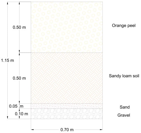Layout of the orange peel/soil column at the start-up of each lysimetric test.