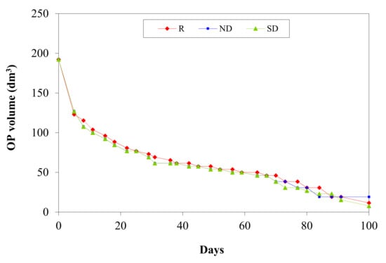 Temporal variation of OP volumes in the lysimetric tests (R, raw OP; ND, naturally drained OP + rainfall; SD, solar-dried OP + rainfall).