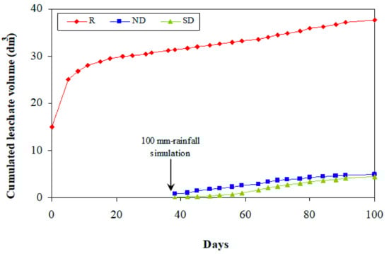 Temporal variation of leachate volumes in the lysimetric tests (R, raw OP; ND, naturally drained OP + rainfall; SD, solar-dried OP + rainfall).