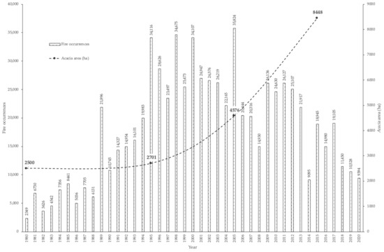 In Portugal, the spreading of species of the genus Acacia has been the subject of several studies, mainly contributing to the mitigation and control of their dispersion since there has been an increment of the occupied areas. Acacia dealbata Link. aroused significant interest due to its dispersion capacity in burnt environments since it is a pyrophyte species [6]. As shown in Figure 2, the increase in the area occupied by species of the genus Acacia occurred precisely when the rise in the number of rural fires started (in the mid-1990s), because of several circumstances, such as the abandonment of rural environment by the population searching better living conditions; the agricultural labor force transferred to the civil construction sector with the advent of public works made possible by European Union funds and by the forest reorganization to produce raw materials in a monoculture regime [6].