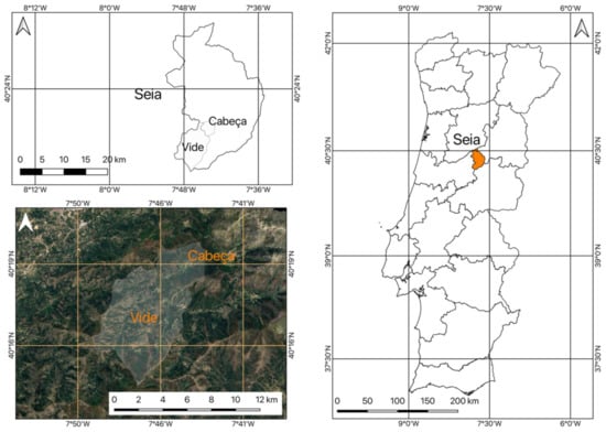 Casal do Rei is in the União de Freguesias de Vide e Cabeça, which is the result of the merge of two parishes in the municipality of Seia (Portugal). The parishes of Cabeça and Vide were unified in the administrative reform of the territory, which was approved by Law No. 56/2012 of 8 November and Law No. 11-A/2013 of 28 January. Figure 3 shows the location of the area under study and its regional and national framework. The site is located on the opposite slope to the villages of Cabeça and Casal do Rei (Figure 3).