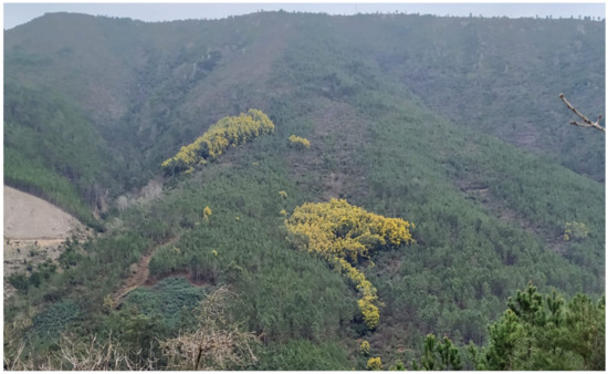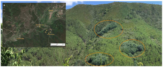 The stands of A. dealbata analyzed in this study are visible from the road that connects Casal do Rei to Cabeça, located on the opposite slope of the Ribeira de Loriga valley, as shown in Figure 4.