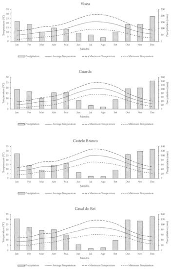 Regarding the climatological characterization, data were searched in the meteorological stations closest geographically to the study area with data that are available on the website of Instituto Português do Mar e da Atmosfera (IPMA). These stations were located in Viseu, Guarda and Castelo Branco. The total absence of thermopluviometric stations in the target area made it impossible to characterize the climate locally. However, there may be significant differences in the conditions observed, mainly due to the difference in altitude at which these thermopluviometric stations are in relation to the target zone. The climatic information for Casal do Rei was simulated through the METEOBLUE platform, available at https://www.meteoblue.com, accessed in 14 January 2021. Figure 5 presents the data collected for the three locations and the data modelled for the target area. The Viseu station is at an altitude of 443 m, with the coordinates 40°39′ N and 7°54′ W. The Guarda station is at an altitude of 1019 m, with the coordinates 40°31′ N and 7°15′ W. The Castelo Branco station is at an altitude of 386 m, with the coordinates 39°50′ N and 7°28′ W. The geographical coordinates of Casal do Rei are 40°31′ N and 7°55′ W and the altitude is 470 m.