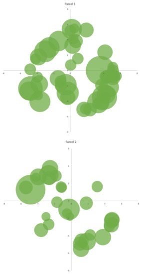 The area for the study was selected following an accessibility criterion. Afterwards, two circular-shaped parcels were delimited with a radius of 15 m, corresponding to an area slightly larger than 700 m2 for each one of the parcels. Given the relatively small size of the area, which is approximately 1960 m2, dispersed over several terraces, and with some difficult to access, there was a slight overlap between the two parcels. Where this overlap occurred, the trees were counted as part of Parcel 1. Subsequently, all the existing trees in each of the parcels were counted, and their relative positions were determined by measuring the distance to the center of Parcels 1 and 2, as shown in Figure 6.