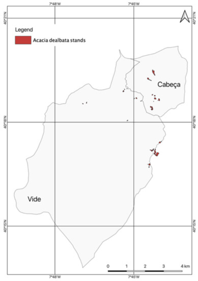 The A. dealbata stands that, in the União de Freguesias de Vide e Cabeça, are of a dispersed nature and occur exclusively in areas that have already been affected by rural fires. These stands, which can still be considered negligible, represent about 11.85 ha in a territory of about 5647.41 ha. However, the potential for expansion is high, given the number of dispersed stands that have already been identified, with 40 throughout the territory, but with a preferential concentration, in number and size, in the territory of the former parish of Cabeça. In this area, stands are located on the opposite hillside to the villages of Cabeça and Casal do Rei, with several stands exceeding 2000 m2 (Figure 7).