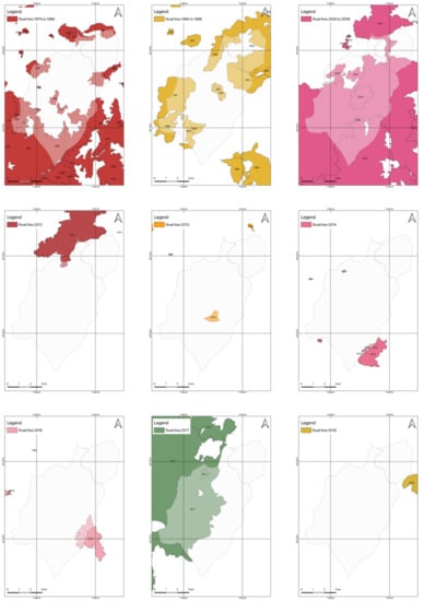 The data relating to rural fires in the União de Freguesias de Vide e Cabeça were obtained through the database of the Instituto para a Conservação da Natureza e da Floresta (ICNF) at http://www.icnf.pt, accessed on 16 January 2021. The data were downloaded in the form of shapefiles and used in GIS QGIS 3.16 Hannover. They were overlaid on the territory boundaries that corresponded to the União de Freguesias de Vide e Cabeça, so that it was possible to visualize the area that is affected by the successive fires in this region.