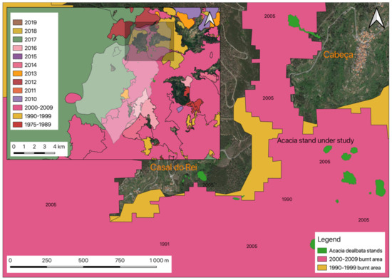 The growth of the area has been a problem, especially after large fires, since A. dealbata, being pyrophyte, benefits from the destruction of the vegetation cover, allowing for its seeds, deposited in the soil for long periods, to benefit from direct exposure to sunlight. Because A. dealbata is heliophilous, it can develop much faster than other plants and, due to its capacity for allelopathy, can prevent or hinder the development of other species [10,11,12]. These plants can occupy the area and thrive with incredible speed to produce seeds, which are released in great abundance onto the soil [13]. As new rural fires have decreased, acacia stands are growing in the direct proportion to their capacity to reach maturity and produce seeds in between new events [14,15]. Thus, their capacity for territorial expansion depends directly on the number of seeds that each specimen can produce and its ability to disperse them around its location [16]. Afterwards, is only a matter of time to the occurrence of a new fire, which will unblock the access to sunlight activating the germination of the seeds [17,18].
