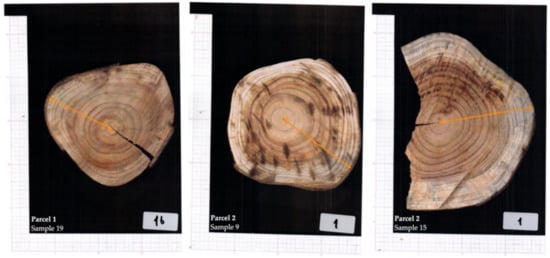 The samples of A. dealbata selected in Parcels 1 and 2 were processed, as described in Section 2.4.3. The slices collected (Figure 10) were used to determine the age of the trees. The height of the trunks and tree crowns were measured and the weight of all the material, obtaining the results that are shown in Table 1.