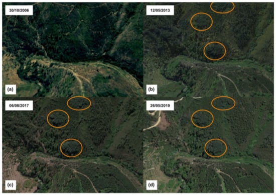 Sentinel-2 satellite images of the A. dealbata stands located on the opposite slope to the villages of Cabeça and Casal do Rei. (a) image obtained on 30 October 2006; (b) image obtained on 12 May 2013; (c) image on 6 August 2017; and, (d) image obtained on 26 May 2019. The observation positioning was chosen to reflect the same view used in the previous Figure 4.